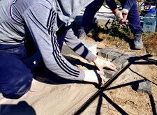 Приступив к работе, мы, первым делом, очистили могилу от травы. Затем положили по периметру места захоронения пятисантиметровую металлическую полосу, которая будет служить границей и дополнительной опорой брусчатке. Получившийся прямоугольник свариваем по углам.