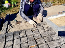 Засыпаем территорию участка пескобетонной смесью и начинаем укладывать брусчатку, одновременно монтируя заранее принесённый памятник.
