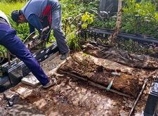 Первым делом мы приступаем к демонтажу объекта: разбираем основание, отодвигаем в сторону уцелевшие элементы надгробья.